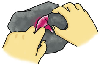 花を石でつぶし、水に入れて色をつけました。色々な花で作りますが、あさがおの紫や赤の花が一番きれいな色になります。