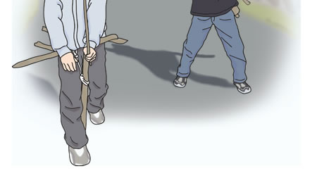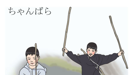 竹や木など、近くにある恰好の良い棒を拾って刀にして遊びます。