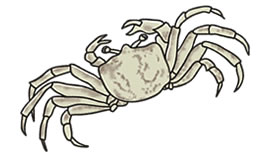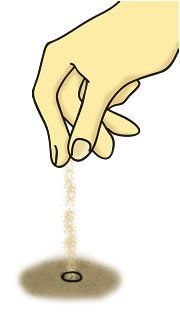 はまちの季節である夏になると、1センチくらいの穴がたくさん砂浜にできます。穴を見つけたら、まず乾いた砂を穴に入れ、ぬれた砂との色の違いで穴をたどりながら、掘り進めて捕まえます。頼りは砂の色と、指の感覚だけですが、もちろん子どもたちは名人。捕まえたはまちは胴体を糸で結び、竹竿の先につけて、走らせて遊びます。遊んだあとはそのまま逃がしました。夜になるとえさを求めて砂浜を走り回るので、明かりを照らして手づかみや足で捕ることもありました。 |