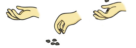 親石をほくり、かけ声に合わせて子石をひらい、親石を受けます。成功するたびに「ひとくいしょう=子石が一つ」「ふたくいしょう=子石が二つ」と、ひらう子石の数が増えます。子石が全部なくなったときにひらった子石の多かった人の勝ち。