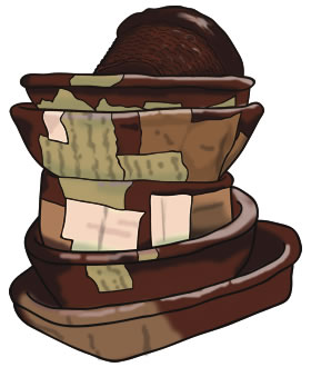 柿渋は、塗ると硬くなり、腐り止めや虫除けの効果もあるので、昔は漁網にも使われていました。ざるなどの入れ物に穴が空いて使えなくなったら、紙を柿渋を塗って貼り、穴をふさいでまた使えるように直しました。紙は手でちぎるとうまく貼ることができます。乾かすときは陰干しで、塗っては乾かし、乾かしては塗るを繰り返していくと、だんだんと濃くなっていきます。さらに、時間がたつことで、色は深みを増していきます。
