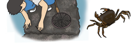 は、川の石のすきまなどにも住んでいますが、海でも防波堤の細い溝などに隠れているので、細い棒で中をつついて捕まえます。