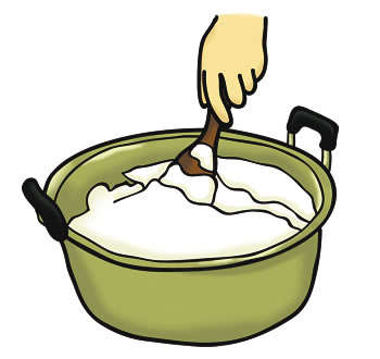 まず2日水につけてふくらませた大豆をすりつぶし、「なまご」と呼ばれるものを作ります。この「なまご」を火にかけ、一煮立ちさせます。
